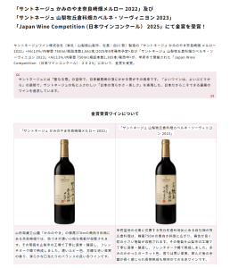 グループ会社のサントネージュワイン株式会社製造の「サントネージュ かみのやま奈良崎畑メルロー 2022」及び「サントネージュ 山梨牧丘倉科畑カベルネ・ソーヴィニヨン 2023」が、