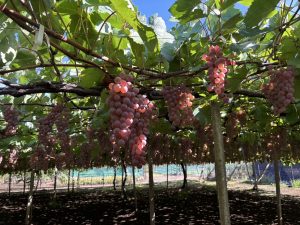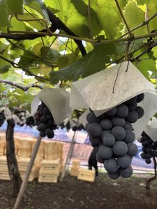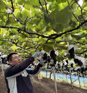 自分の肩よりも高い位置に実ったぶどうを見上げながら切って、傷んだ粒がないか1房ずつ確認しながらコンテナに入れるという一連の作業をずっと行ないます。